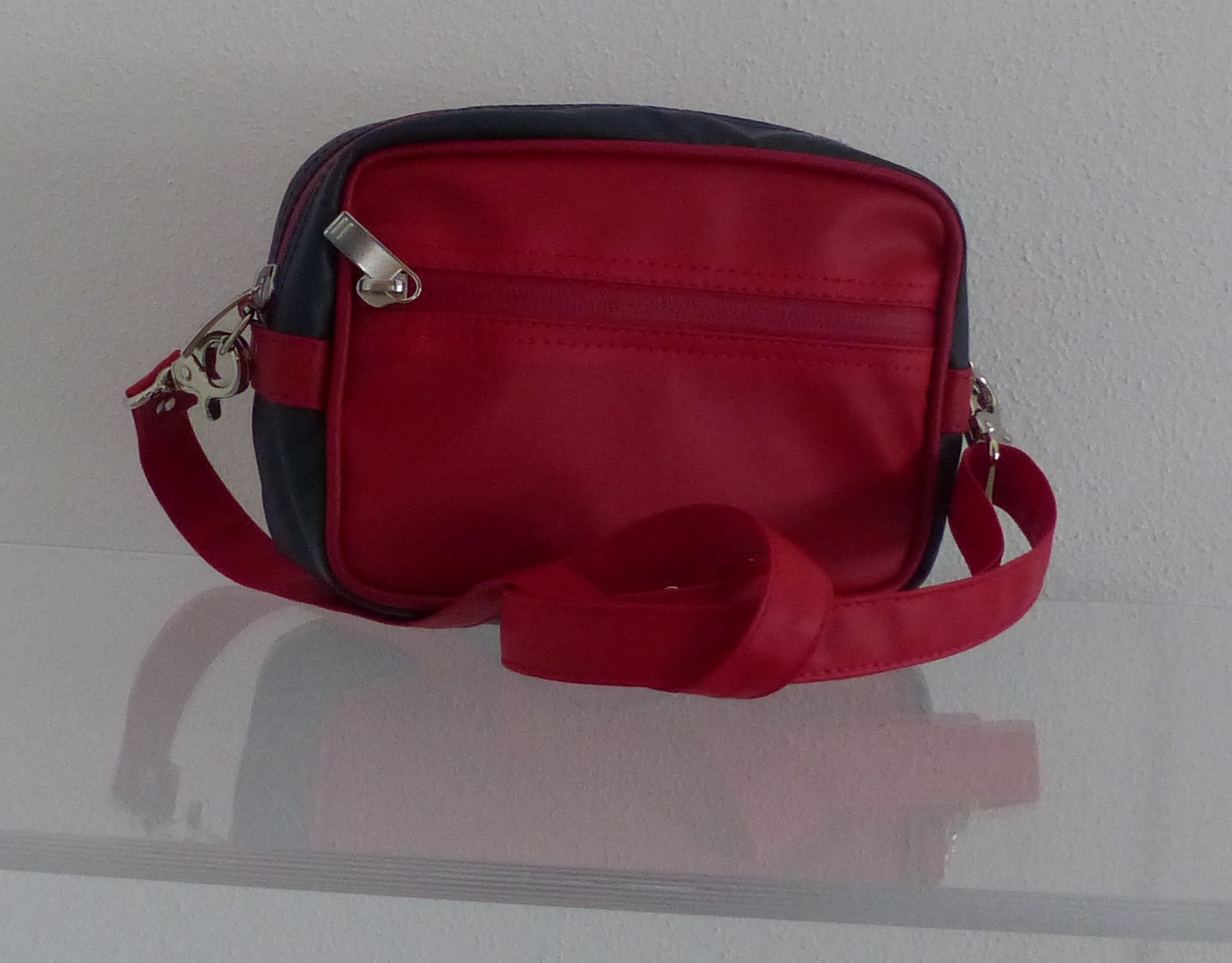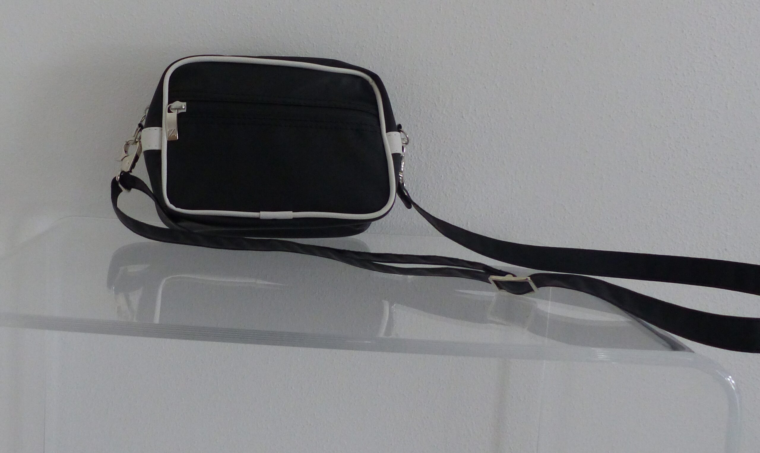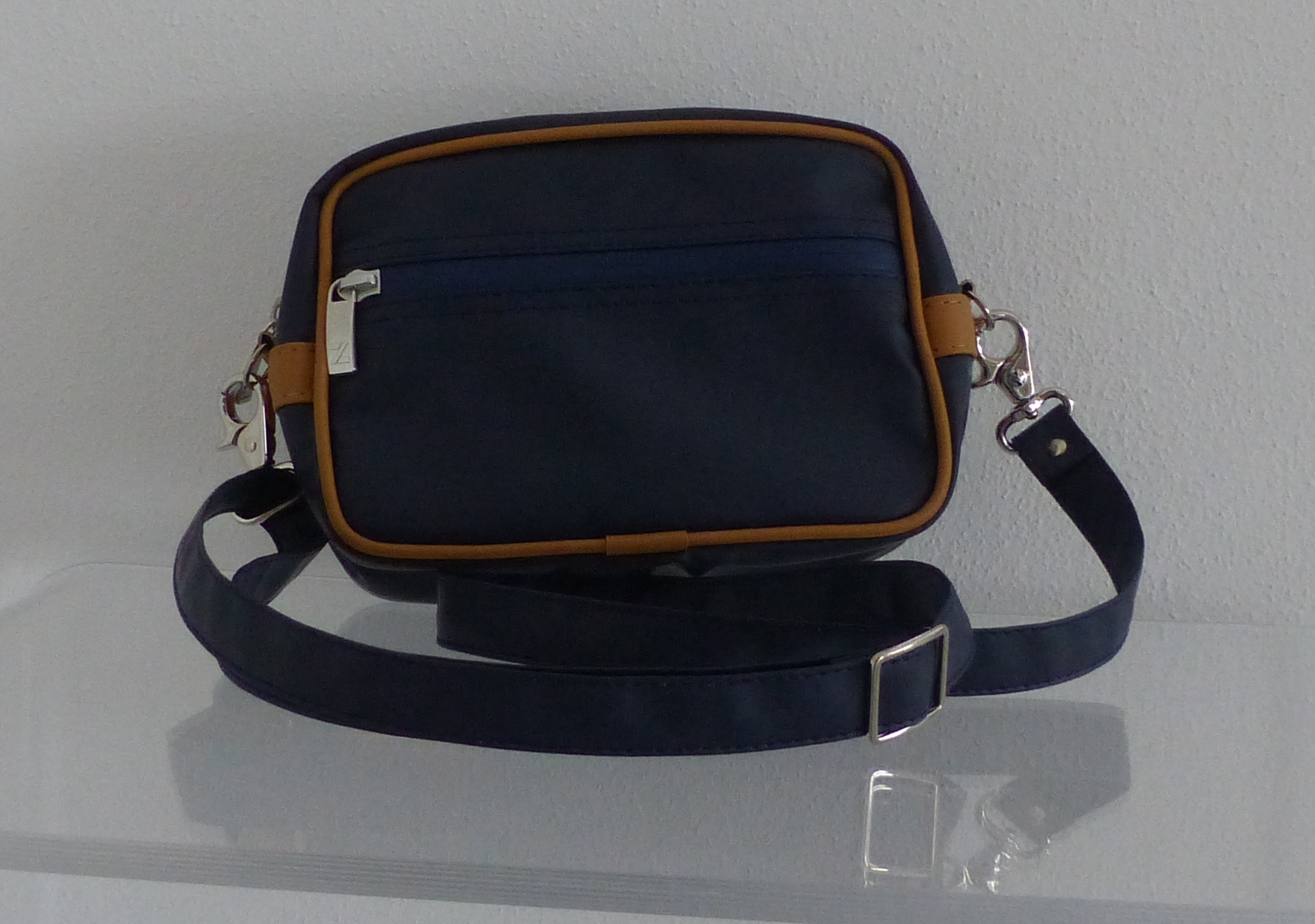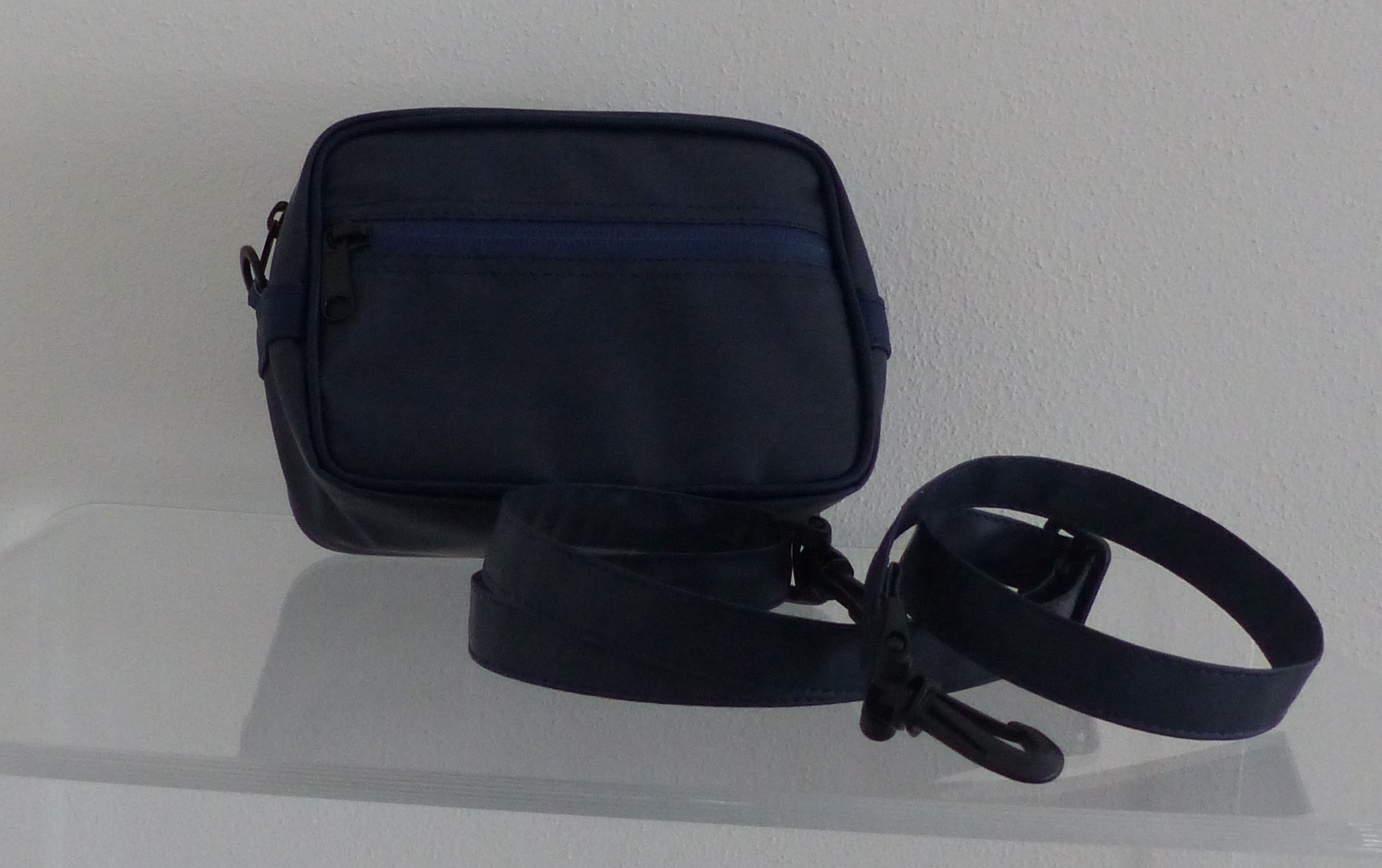 wasserdichtes und farbechtes Stoffgewebe mit einer Lederoptik kombiniert, gummierte (YKK-) Reißverschlüsse, abnehmbarer Schultergurt (verlängerbar bis ca. 120 cm, Karabinerhaken), Reißverschlusstasche außen