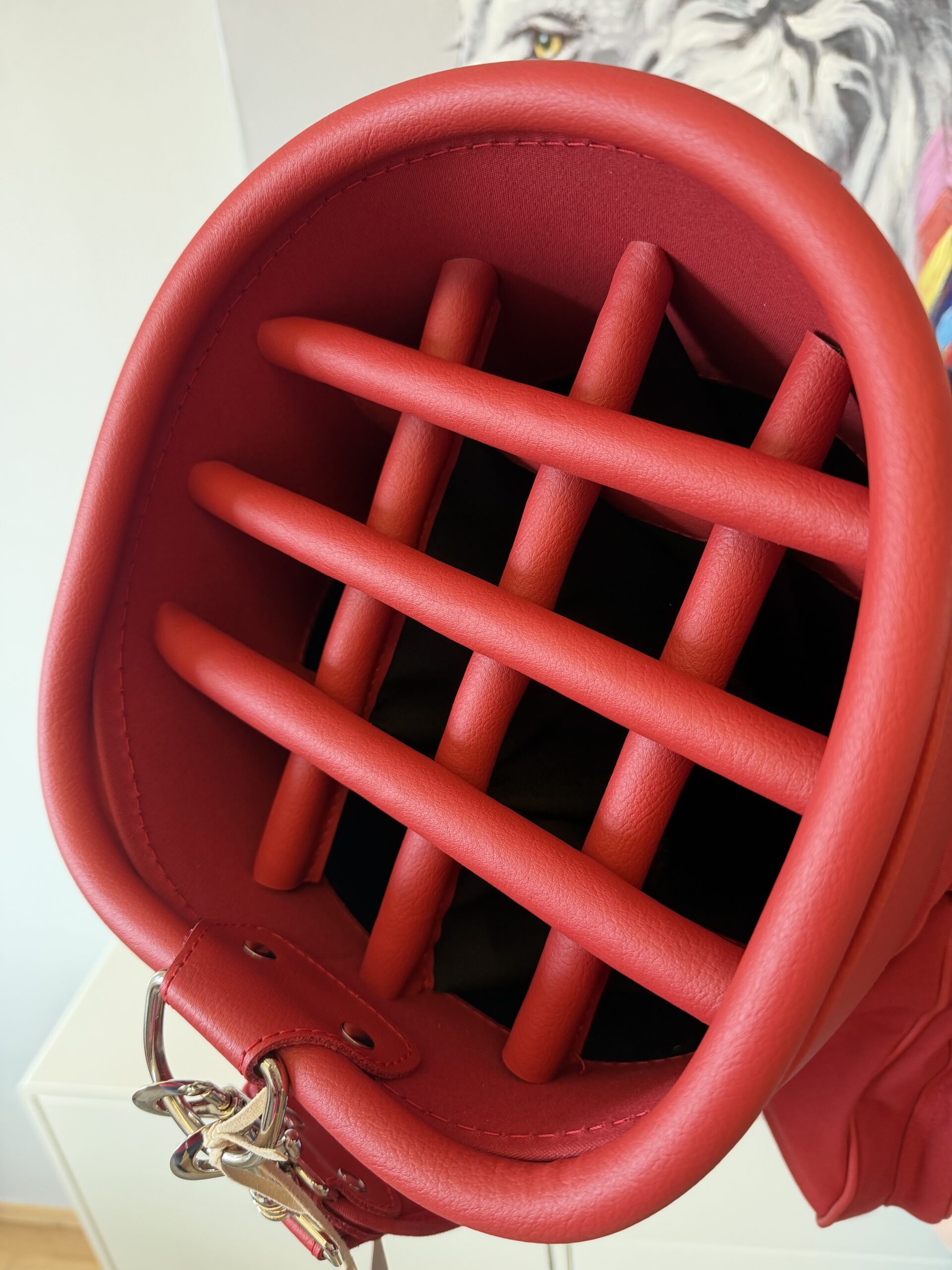 14erTeilung (am Boden fixiert), Regenschirmhalter, Karabinerhaken für Accessorybag, gummierte Marken-Reißverschlüsse, Ring für Putztuch, gefüttertes Schmuck-/Handycompartment, Tee-Streifen, Taschenhaube, Schultergurt,