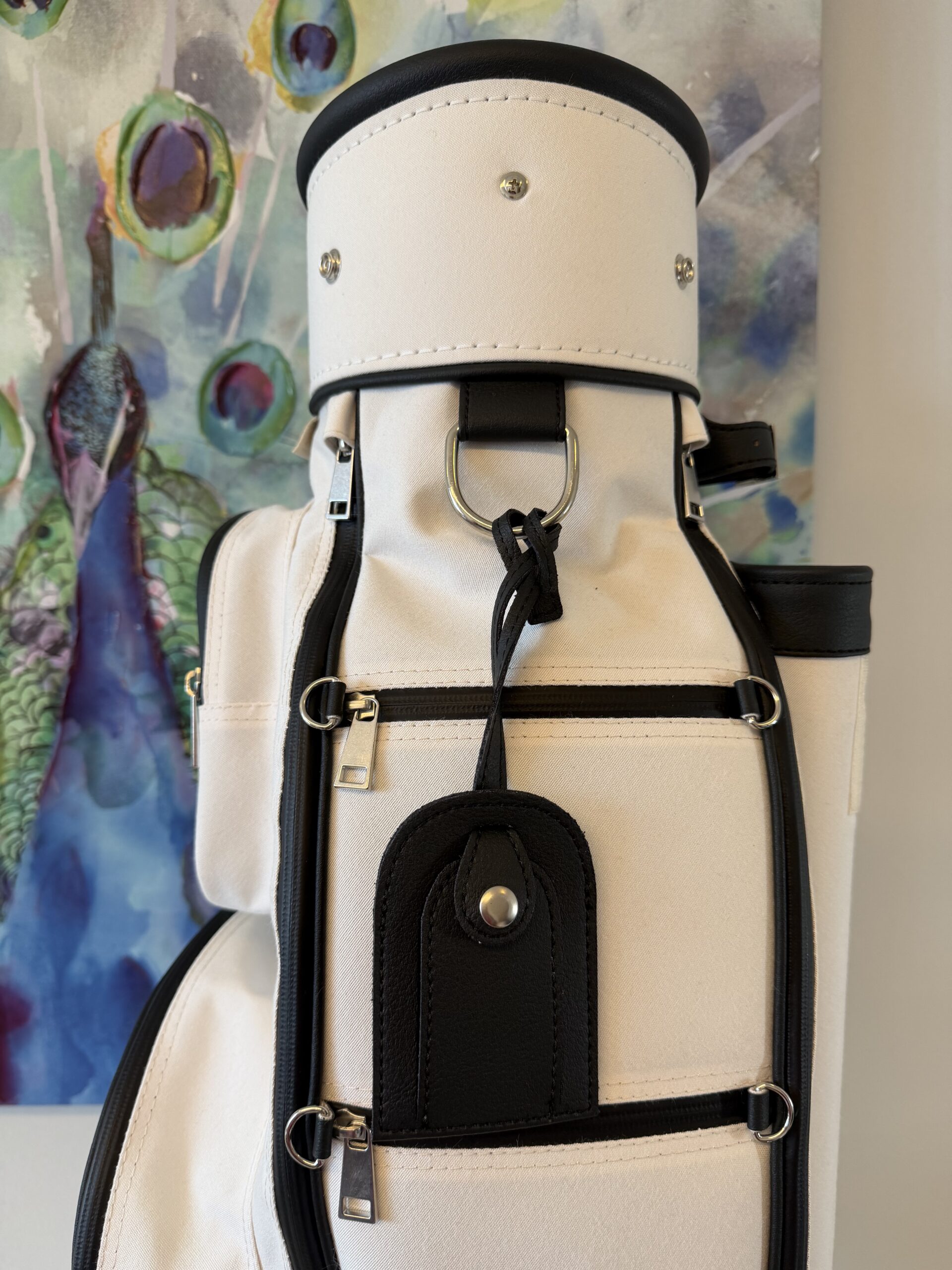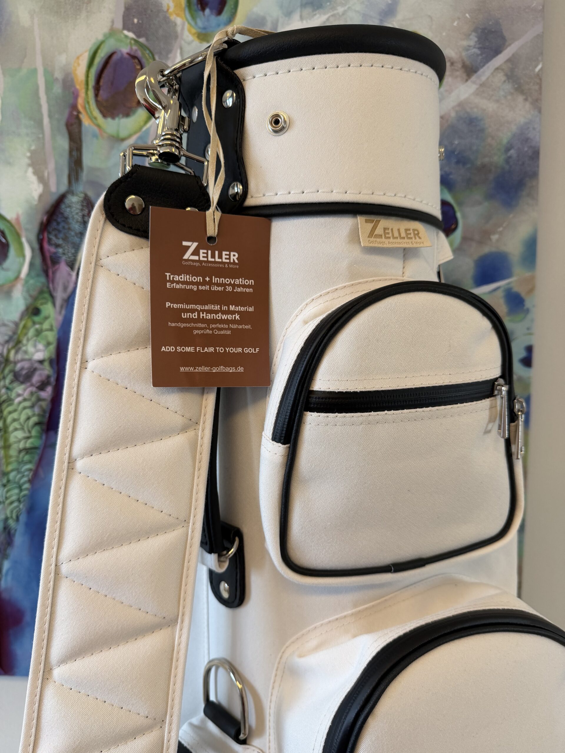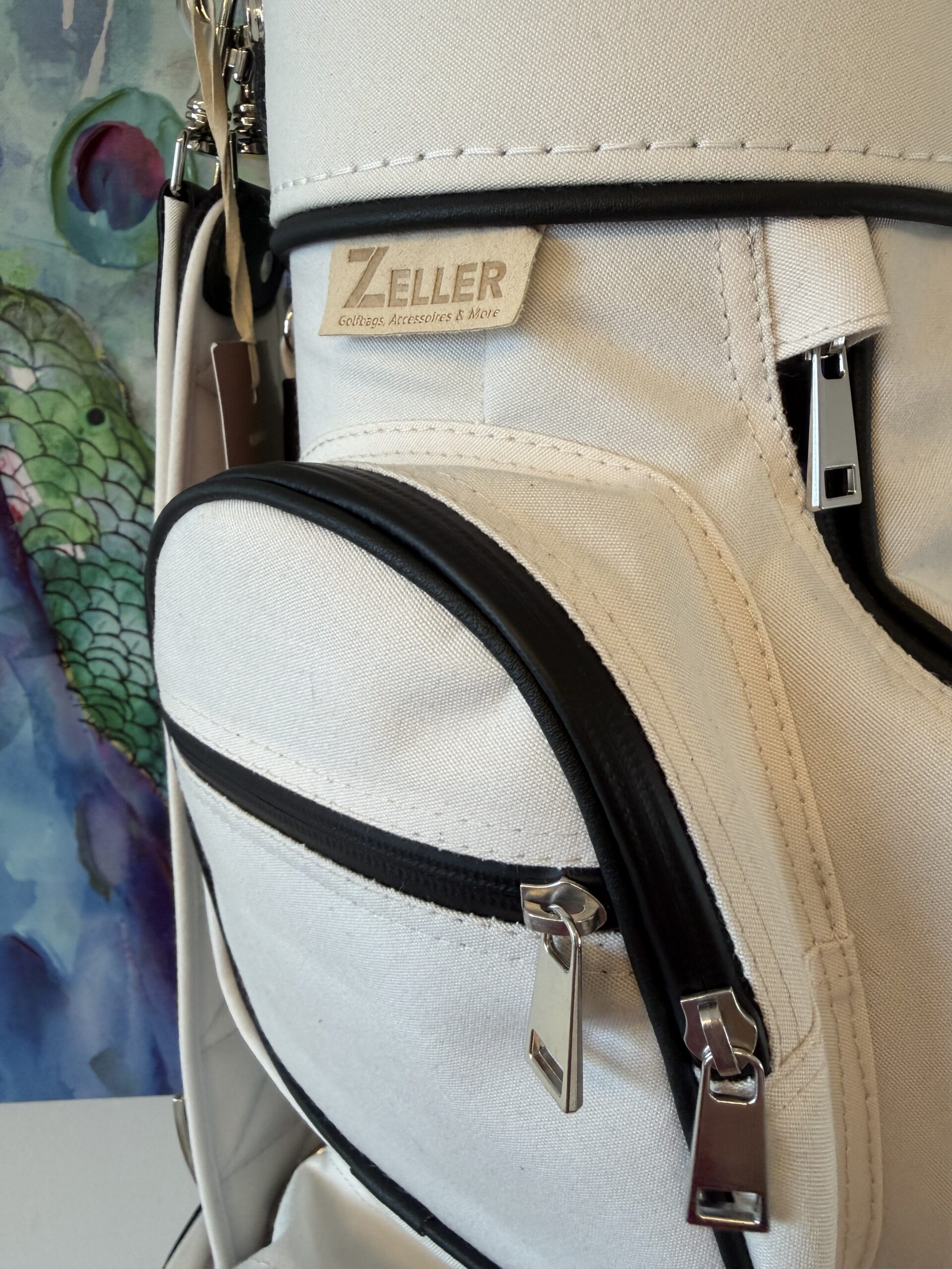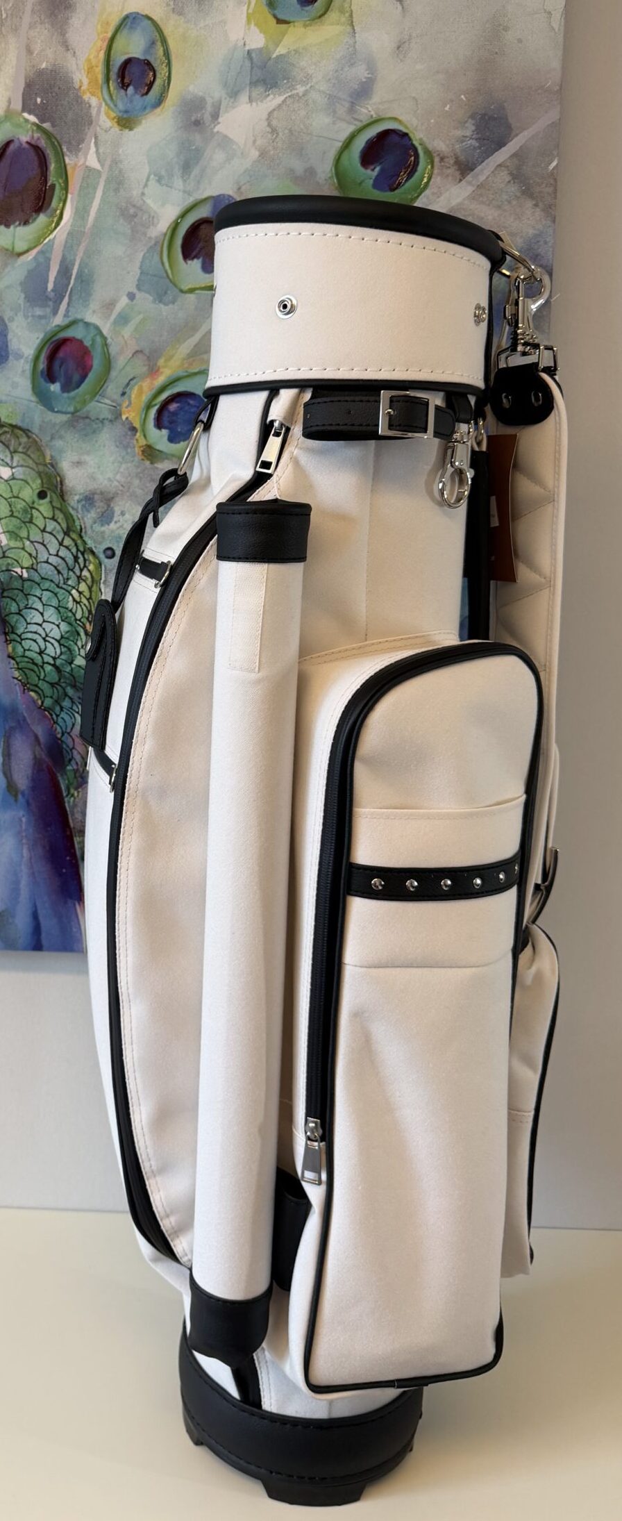 letztes Bag in dieser Kombination 7″ Innendurchmesser, 8erTeilung (am Boden fixiert), Regenschirmhalter, Karabinerhaken für Accessorybag, Putterrohr mit Klett für Handschuh, gummierte Marken-Reißverschlüsse, Ring für Putztuch,  Taschenhaube, Schultergurt, Adressanhänger, Putterrohr aussen mit Klett für Handschuh, 1 Steckfach, Teestreifen seitlich, Getränkecooler, Ball- oder Batterietasche, Accessorybag
