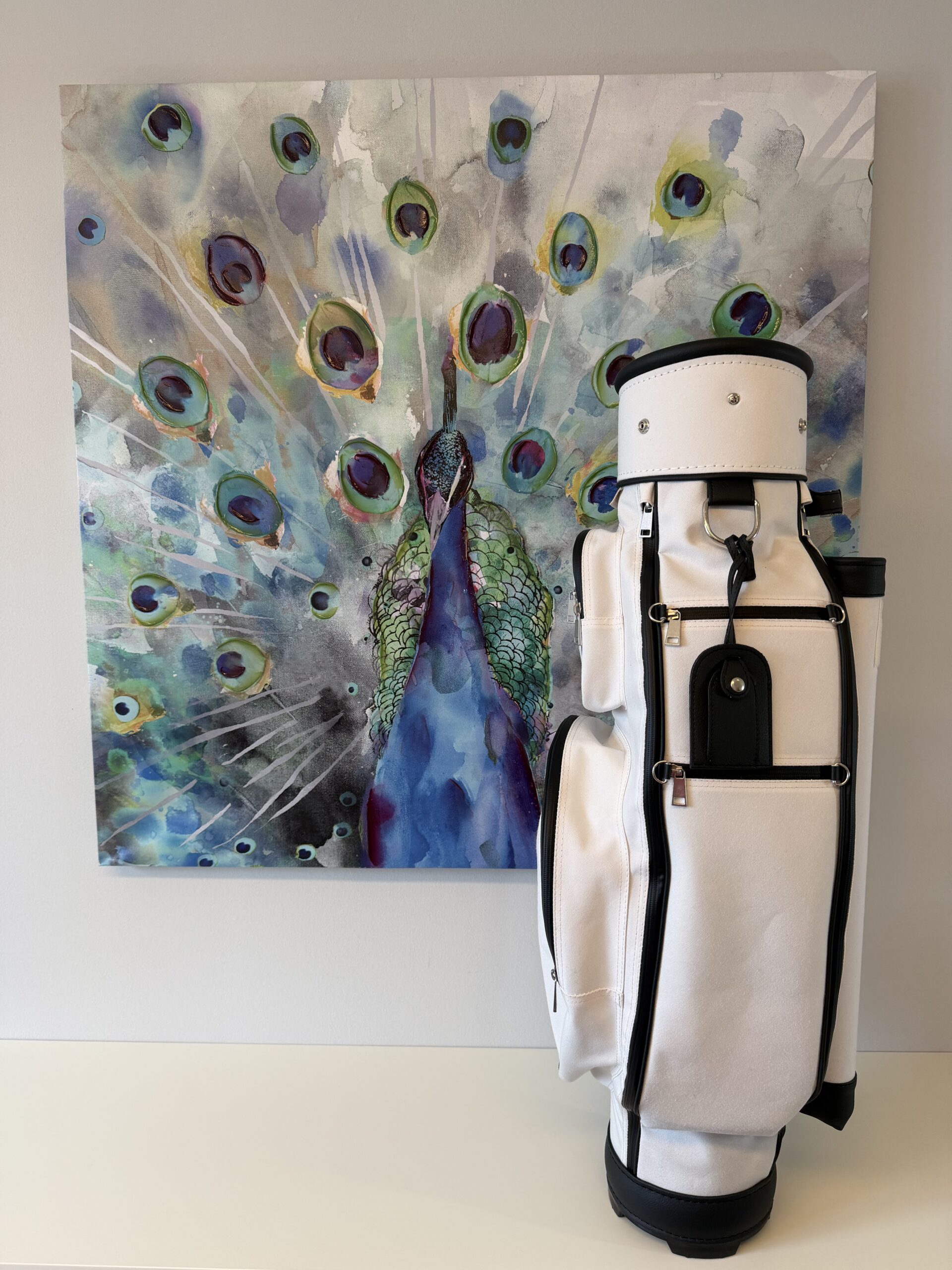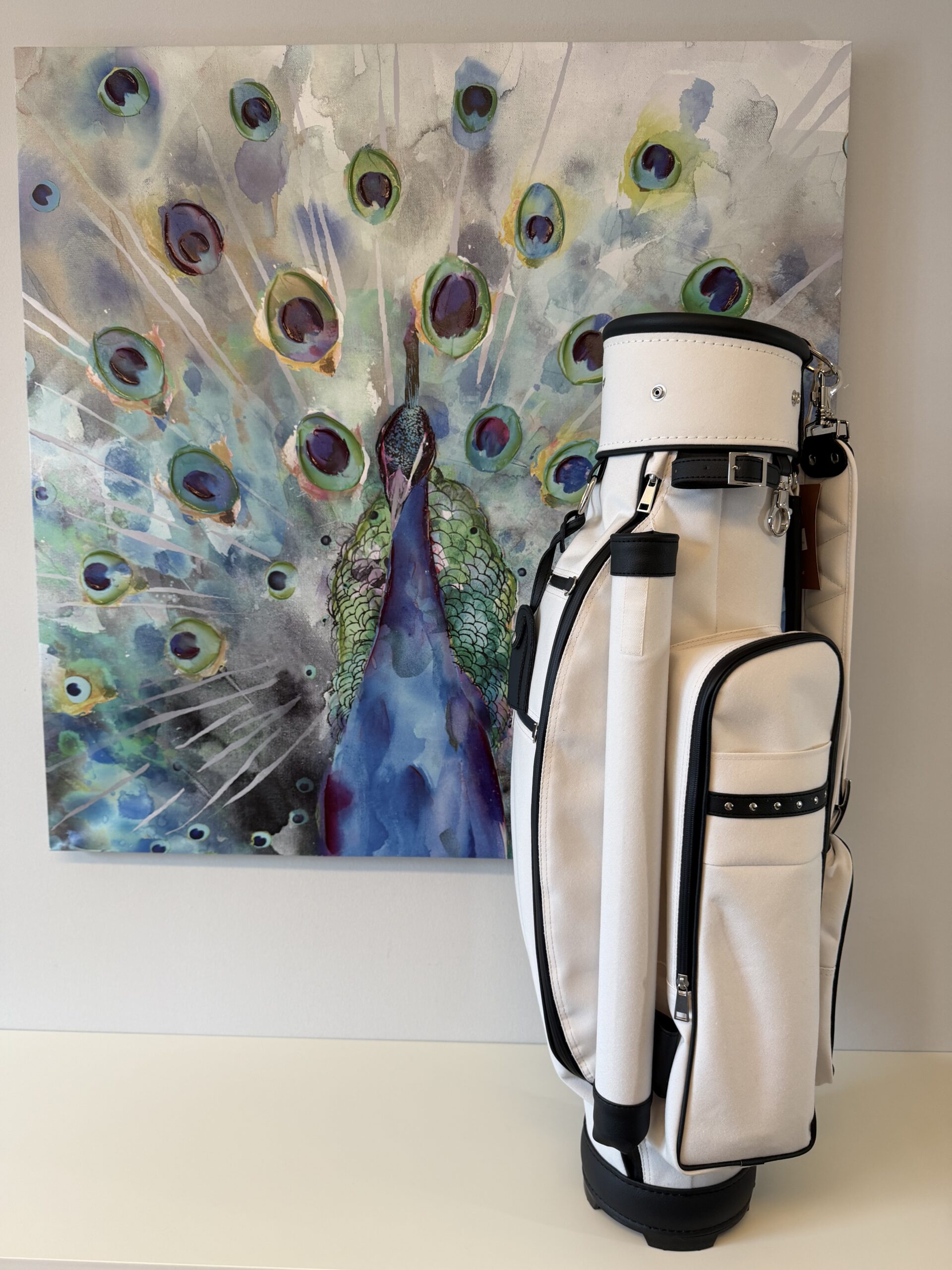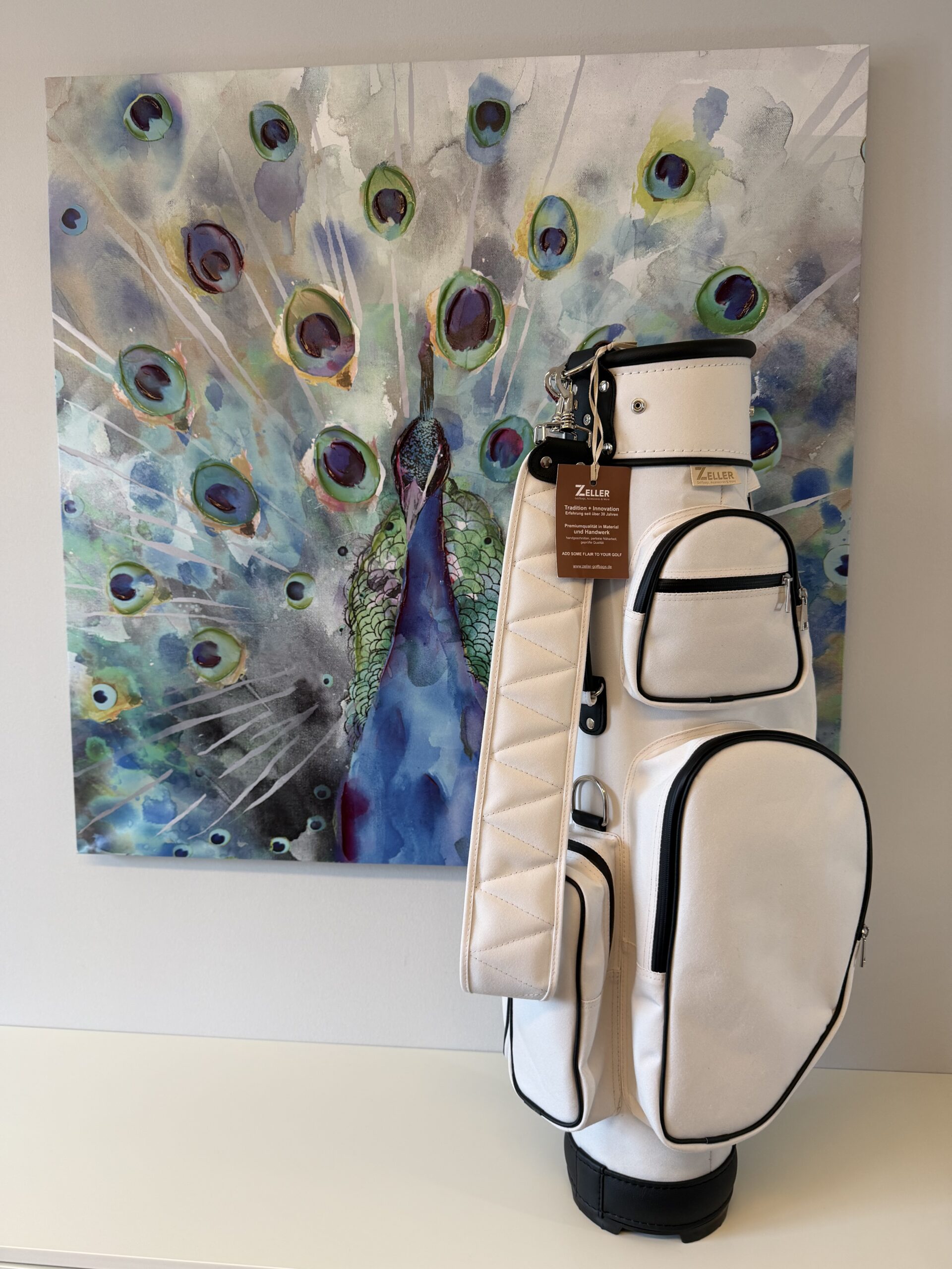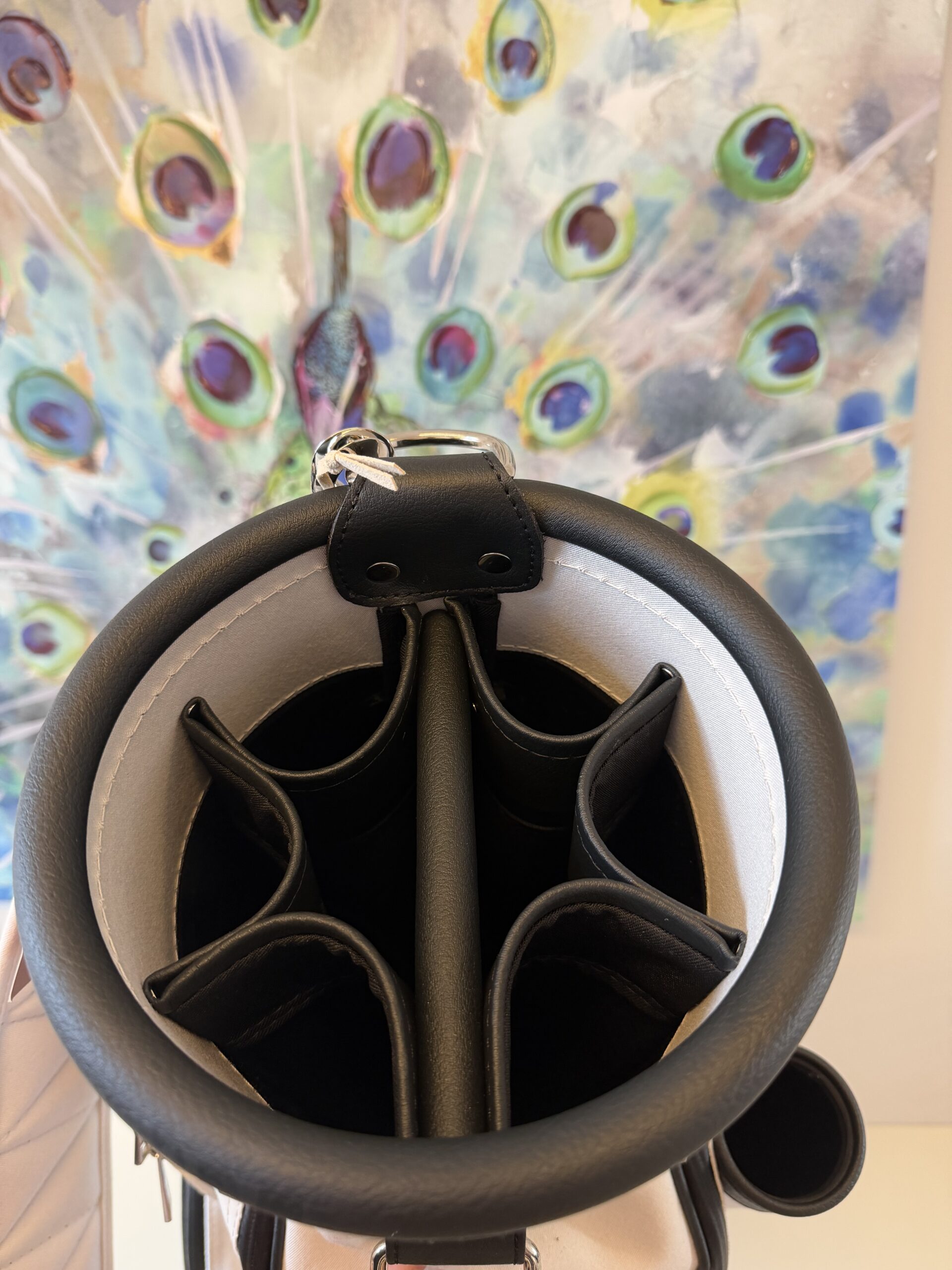letztes Bag in dieser Kombination 7″ Innendurchmesser, 8erTeilung (am Boden fixiert), Regenschirmhalter, Karabinerhaken für Accessorybag, Putterrohr mit Klett für Handschuh, gummierte Marken-Reißverschlüsse, Ring für Putztuch,  Taschenhaube, Schultergurt, Adressanhänger, Putterrohr aussen mit Klett für Handschuh, 1 Steckfach, Teestreifen seitlich, Getränkecooler, Ball- oder Batterietasche, Accessorybag